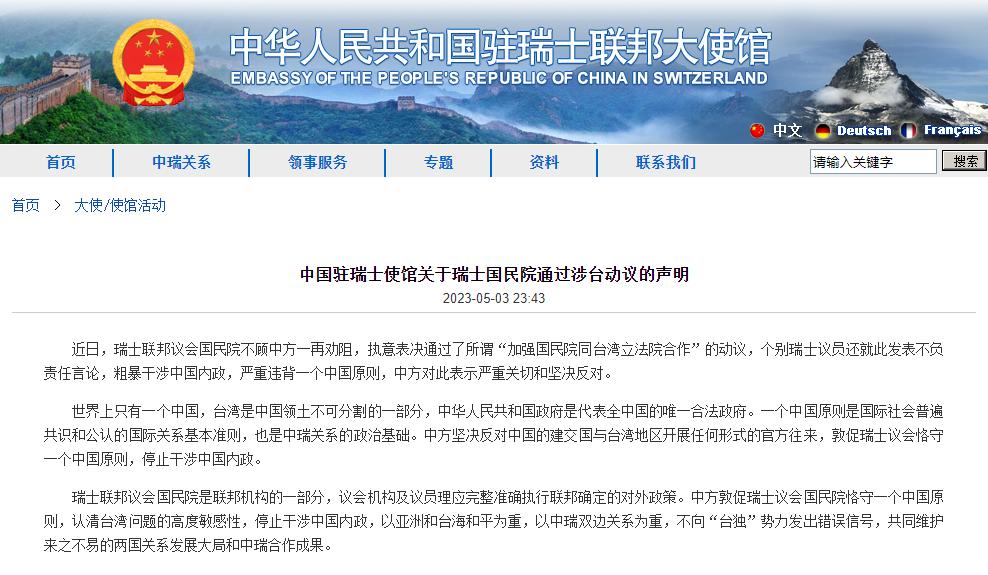香港新聞網5月4日電 中國駐瑞士大使館網站5月3日消息,近日,瑞士聯邦議會國民院不顧中方一再勸阻,執意表決通過了所謂“加強國民院同台灣立法院合作”的動議,個別瑞士議員還就此發表不負責任言論,粗暴干涉中國內政,嚴重違背一個中國原則,中方對此表示嚴重關切和堅決反對。 世界上只有一個中國,台灣是中國領土不可分割的一部分,中華人民共和國政府是代表全中國的唯一合法政府。一個中國原則是國際社會普遍共識和公認的國際關係基本準則,也是中瑞關係的政治基礎。中方堅決反對中國的建交國與台灣地區開展任何形式的官方往來,敦促瑞士議會恪守一個中國原則,停止干涉中國內政。 瑞士聯邦議會國民院是聯邦機構的一部分,議會機構及議員理應完整準確執行聯邦確定的對外政策。中方敦促瑞士議會國民院恪守一個中國原則,認清台灣問題的高度敏感性,停止干涉中國內政,以亞洲和台海和平為重,以中瑞雙邊關係為重,不向“台獨”勢力發出錯誤信號,共同維護來之不易的兩國關係發展大局和中瑞合作成果。