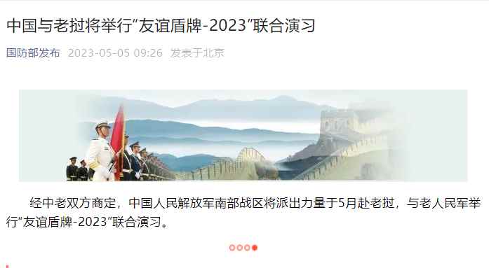 香港新聞網5月5日電 據“國防部發佈”微信公眾號消息,經中老雙方商定,中國人民解放軍南部戰區將派出力量於5月赴老撾,與老人民軍舉行“友誼盾牌-2023”聯合演習。