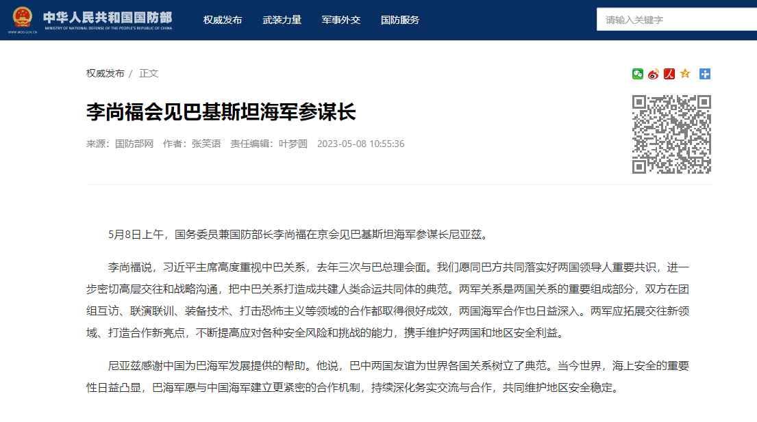 李尚福說,中方高度重視中巴關係,願同巴方共同落實好兩國領導人重要共識,進一步密切高層交往和戰略溝通,把中巴關係打造成共建人類命運共同體的典範。兩軍關係是兩國關係的重要組成部分,雙方在團組互訪、聯演聯訓、裝備技術、打擊恐怖主義等領域的合作都取得很好成效,兩國海軍合作也日益深入。兩軍應拓展交往新領域、打造合作新亮點,不斷提高應對各種安全風險和挑戰的能力,攜手維護好兩國和地區安全利益。 尼亞茲感謝中國為巴海軍發展提供的幫助。他說,巴中兩國友誼為世界各國關係樹立了典範。當今世界,海上安全的重要性日益凸顯,巴海軍願與中國海軍建立更緊密的合作機制,持續深化務實交流與合作,共同維護地區安全穩定。(完) 【編輯:丘志彬】