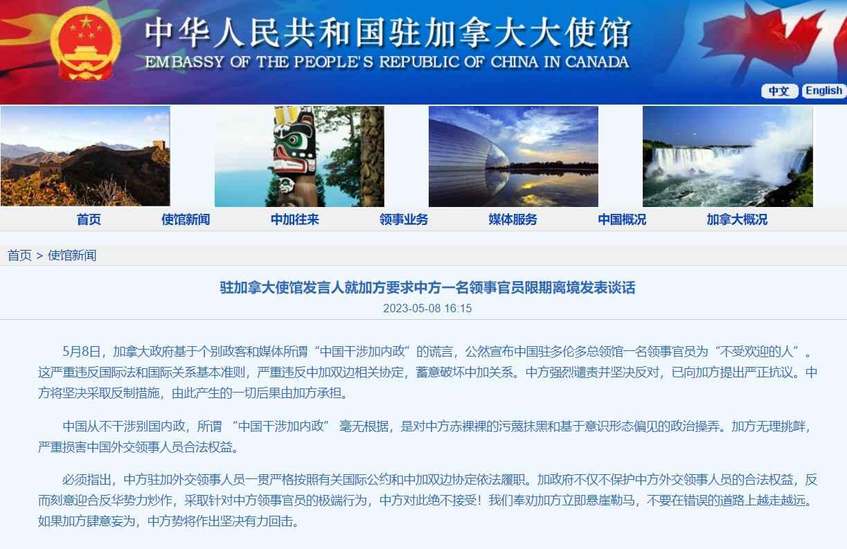 香港新聞網5月9日電 5月8日,加拿大政府基於個別政客和媒體所謂“中國干涉加內政”的謊言,公然宣佈中國駐多倫多總領館一名領事官員為“不受歡迎的人”。這嚴重違反國際法和國際關係基本準則,嚴重違反中加雙邊相關協定,蓄意破壞中加關係。中方強烈譴責並堅決反對,已向加方提出嚴正抗議。中方將堅決採取反制措施,由此產生的一切後果由加方承擔。