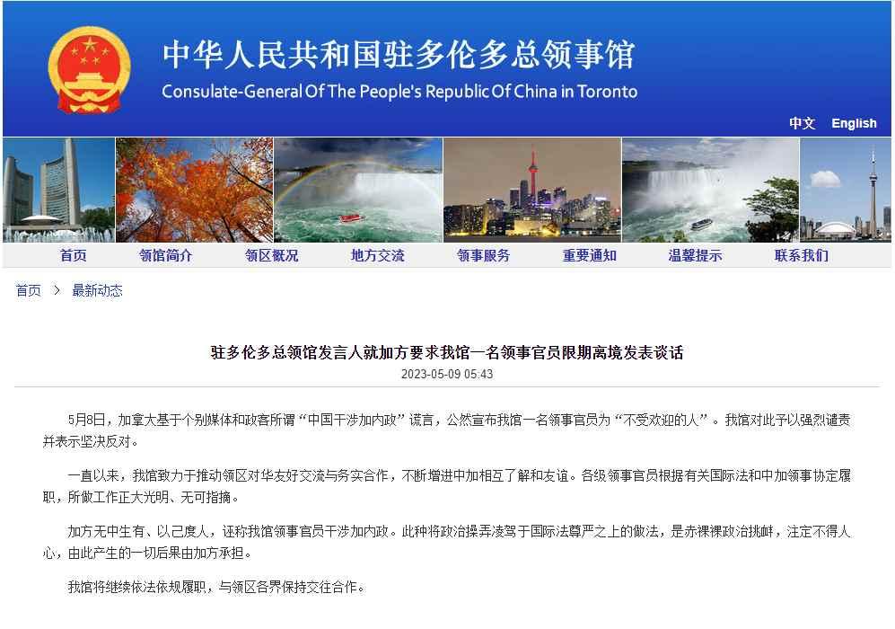 香港新聞網5月9日電 據中國駐多倫多總領館網站5月9日消息,中國駐多倫多總領館發言人就加方要求我館一名領事官員限期離境發表談話。