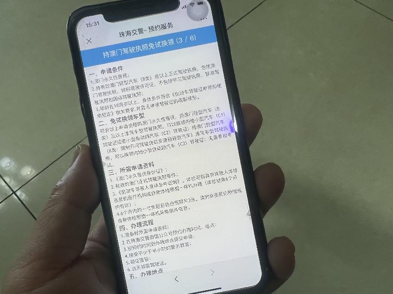 澳門居民換領內地駕照可到“珠海交警”公眾號進行預約申請。(香港文匯網記者 方俊明 攝) 澳門居民換領內地駕照申請條件與手續已發布 澳門交通事務局表示,持內地駕駛證在澳門駕駛須是持有效內地小型汽車(C1)或小型自動擋汽車(C2)或以上準駕車型紙質的駕駛證的合法入境和逗留人士。而記者也從珠海市公安局交通警察支隊獲悉,澳門居民換領內地駕照相關具體申請條件和手續已發布。申請者需要到“珠海交警”公眾號進行預約,該公眾號還公布了澳門居民換領內地駕照相關辦理流程和辦理地點。 據透露,持澳門駕駛執照免試換領申請者須為澳門永久性居民,持有效澳門輕型汽車(B類)或以上正式駕駛執照,包括澳門駕駛執照、特別駕駛許可證,不包括學習駕駛執照、暫準駕駛執照和國際駕駛執照,年齡在18周歲以上,身體條件符合《機動車駕駛證申領和使用規定》相關要求,並且無申請駕駛證的限制情形。 促進粵澳兩地往來互通 出遊“說走就走” 澳門車主梁先生告訴記者,駕照互認措施正式出台,是繼“澳車北上”政策落地後,又一便利粵港澳大灣區居民往來的利好。這些新舉措將促進粵澳兩地往來互通,越來越多居民可以直接開車過關,出遊“說走就走”。他也建議兩地相關部門可對車主加強宣傳與提供相關培訓,讓更多車主了解粵澳兩地交通規則異同,並做好相關配套,解決車主跨境駕車時所遇到的困擾。 也有專家指出,“澳車北上”政策與駕駛證互認換領將形成疊加效應,更好地促進內地與澳門交流合作;而這些舉措實施的背後也涉及包括交管、海關、口岸、保險等領域的一系列制度創新和規則銜接,將進一步促進灣區“軟聯通”,助力灣區融合發展。 【編輯:丘志彬】