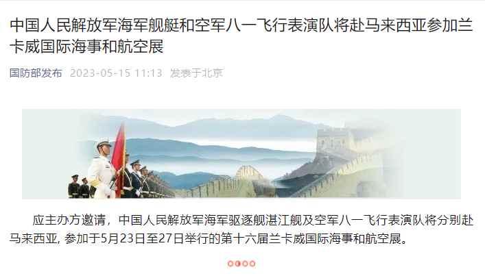 香港新聞網5月15日電 據國防部發布微信公眾號消息,應主辦方邀請,中國人民解放軍海軍驅逐艦湛江艦及空軍八一飛行表演隊將分別赴馬來西亞, 參加於5月23日至27日舉行的第十六屆蘭卡威國際海事和航空展。