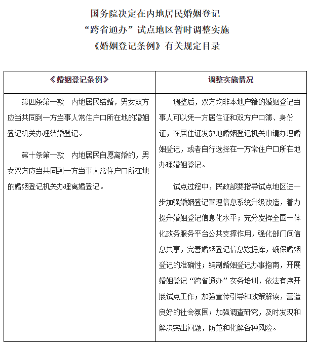 全文如下: 國務院關於同意擴大內地居民婚姻登記“跨省通辦”試點的批復 國函〔2023〕34號 民政部: 你部關於擴大內地居民婚姻登記“跨省通辦”試點的請示收悉。現批復如下: 一、同意擴大內地居民婚姻登記“跨省通辦”試點。調整後,在北京、天津、河北、內蒙古、遼寧、上海、江蘇、浙江、安徽、福建、江西、山東、河南、湖北、廣東、廣西、海南、重慶、四川、陜西、寧夏等21個省(自治區、直轄市)實施結婚登記和離婚登記“跨省通辦”試點。 二、在試點地區,相應暫時調整實施《婚姻登記條例》第四條第一款、第十條第一款的有關規定(目錄附後)。調整後,雙方均非本地戶籍的婚姻登記當事人可以憑一方居住證和雙方戶口簿、身份證,在居住證發放地婚姻登記機關申請辦理婚姻登記,或者自行選擇在一方常住戶口所在地辦理婚姻登記。 三、試點期為自批復之日起2年。 附件:國務院決定在內地居民婚姻登記“跨省通辦”試點地區暫時調整實施《婚姻登記條例》有關規定目錄 國務院 2023年5月12日 附件: