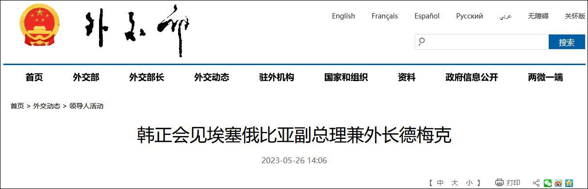香港新聞網5月26日電 據中國外交部網站消息,2023年5月26日,國家副主席韓正在北京會見埃塞俄比亞副總理兼外長德梅克。