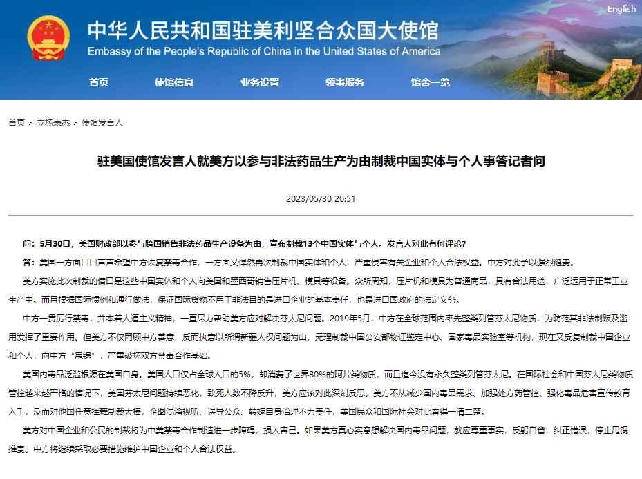 香港新聞網5月31日電 5月30日,美國財政部以參與跨國銷售非法藥品生產設備為由,宣佈制裁13個中國實體與個人。中國駐美國使館發言人就此事回應稱,美國一方面口口聲聲希望中方恢復禁毒合作,一方面又悍然再次制裁中國實體和個人,嚴重侵害有關企業和個人合法權益。中方對此予以強烈譴責。