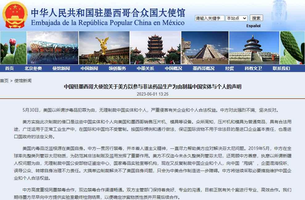 香港新聞網6月1日電 中國駐墨西哥大使館網站6月1日發佈《中國駐墨西哥大使館關於美方以參與非法藥品生產為由制裁中國實體與個人的聲明》。