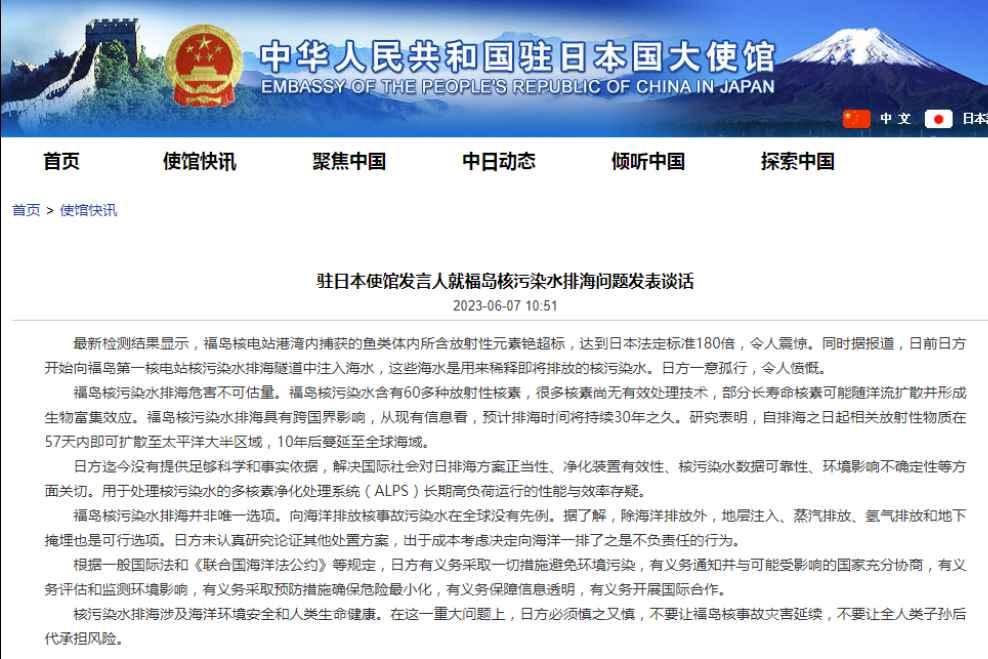 中國駐日本大使館網站截圖 據使館發布的聲明,最新檢測結果顯示,福島核電站港灣內捕獲的魚類體內所含放射性元素銫超標,達到日本法定標準180倍,令人震驚。 聲明說,福島核污染水排海危害不可估量。福島核污染水含有60多種放射性核素,很多核素尚無有效處理技術,部分長壽命核素可能隨洋流擴散並形成生物富集效應。福島核污染水排海具有跨國界影響,從現有信息看,預計排海時間將持續30年之久。研究表明,自排海之日起相關放射性物質在57天內即可擴散至太平洋大半區域,10年後蔓延至全球海域。 聲明還說,根據一般國際法和《聯合國海洋法公約》等規定,日方有義務採取一切措施避免環境污染,通知並與可能受影響的國家充分協商,評估和監測環境影響,採取預防措施確保危險最小化,保障信息透明,以及開展國際合作。 日本政府2021年4月13日正式決定,將福島第一核電站上百萬噸核污染水過濾並稀釋後排入大海。本月5日,日本東京電力公司開始向福島第一核電站核污染水排海隧道中注入海水。(完) 【編輯:凌玉辉】