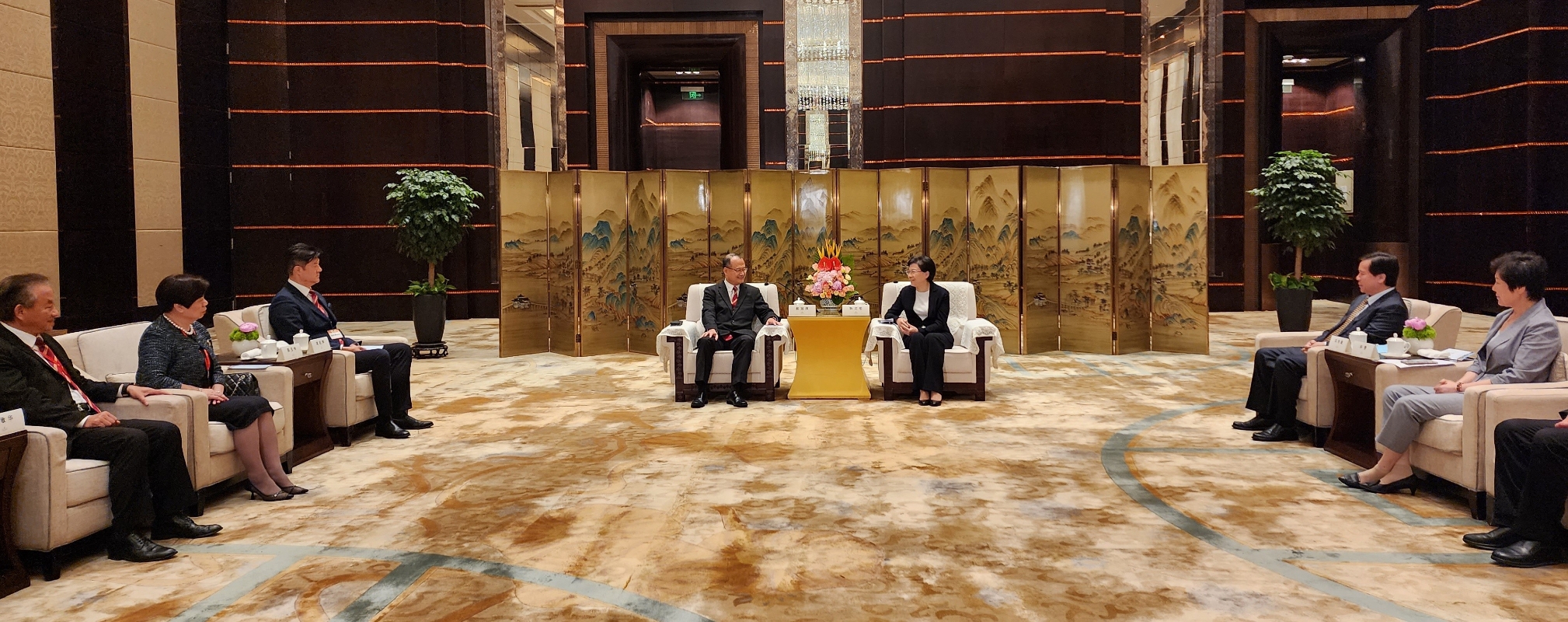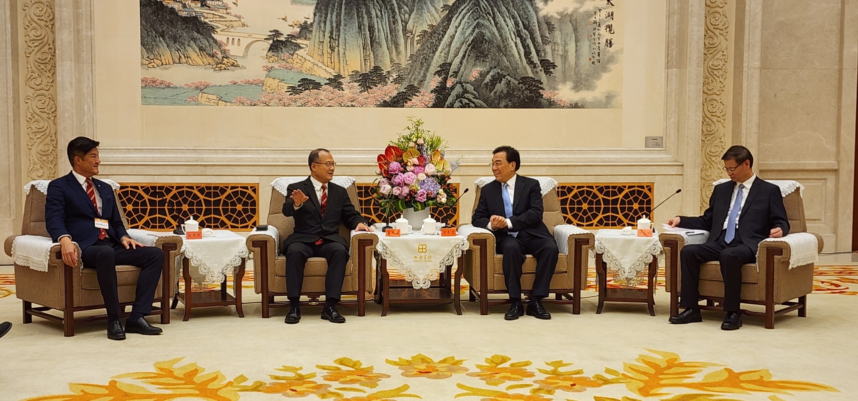 南京市委書記韓立明(正中右)與中總訪問團會面交流 深化校企合作助產學融合 代表團一行前往有逾百年歷史的南京大學,與該校黨委書記、中國科學院院士譚鐵牛舉行會談。蔡冠深會長向該校捐款1,000萬元人民幣,部份代表團成員亦積極響應,表達對教育的支持意向,為國家和社會培育更多人才。