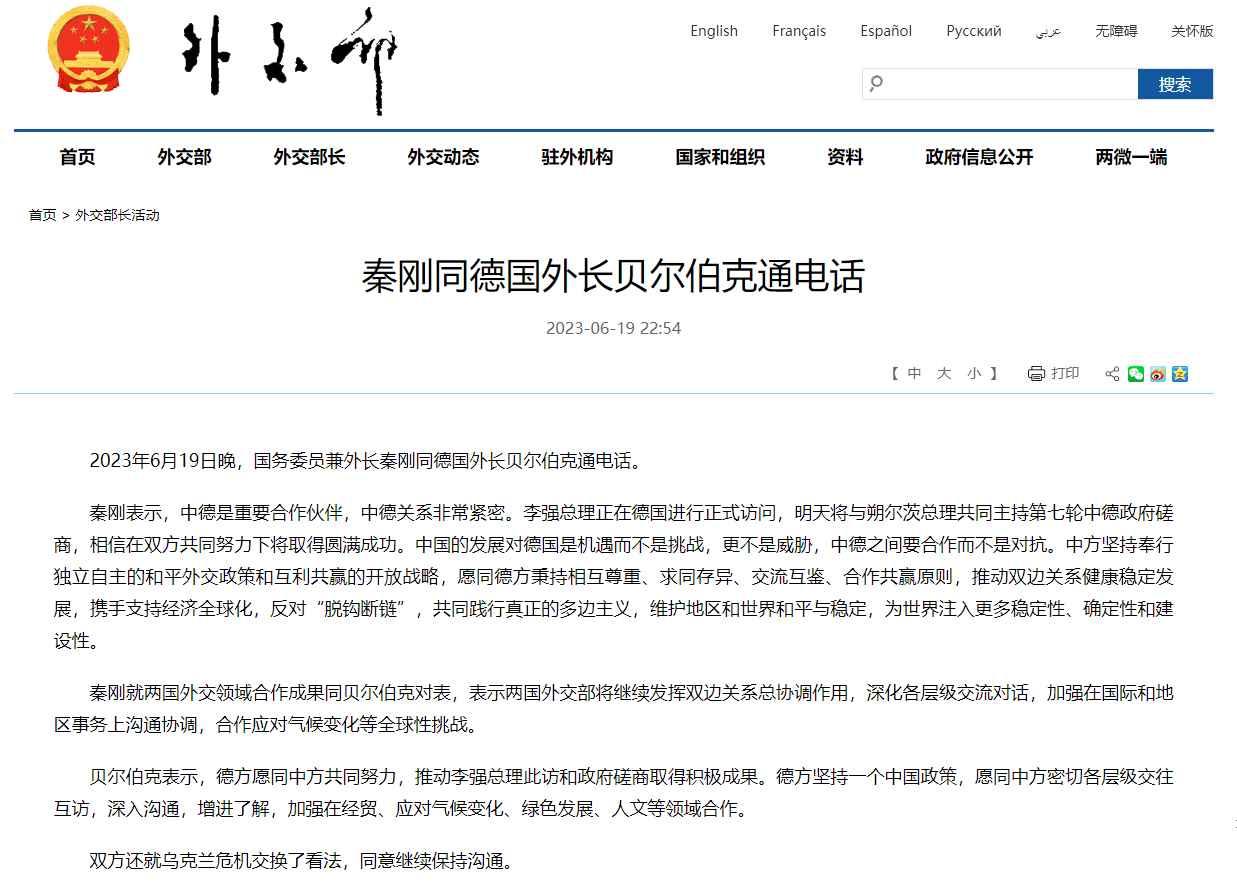 香港新聞網6月20日電 據中國外交部網站消息,2023年6月19日晚,國務委員兼外長秦剛同德國外長貝爾伯克通電話。