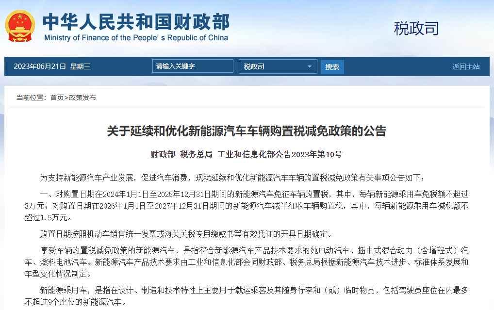 香港新聞網6月21日電 中國財政部網站6月21日消息,財政部、稅務總局、工業和信息化部發佈《關於延續和優化新能源汽車車輛購置稅減免政策的公告》。