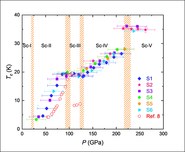 元素超導體為研究超導電性提供了一個最簡單、最乾淨的材料平台。自從1911年荷蘭科學家昂尼斯在元素汞中發現超導電性以來,越來越多的元素被發現具有超導電性。目前,共有50多種元素在常壓或高壓環境下被發現具有超導電性。然而,大多數元素的超導轉變溫度都較低,之前最高的元素超導轉變溫度為26K,是由元素鈦在高壓下所實現。 早期研究發現,元素鈧在壓力下會經歷四個結構相變。在23 GPa以上,Sc-I相會轉變為Sc-II相,並且Sc-II相的超導轉變溫度在100GPa左右達到最高近20K,其相對較高的超導轉變溫度被認為是來源於電子逐漸從4s軌道向3d軌道轉移所導致。由於早期高壓實驗技術的限制,元素鈧在更高壓力下的超導電性研究仍然十分缺乏。