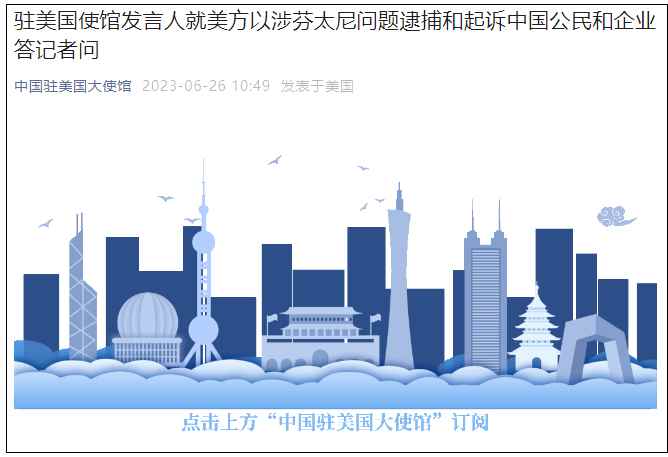 香港新聞網6月26日電 據微信公眾號“中國駐美國大使館”6月26日消息,駐美國使館發言人就美方以涉芬太尼問題逮捕和起訴中國公民和企業答記者問。
