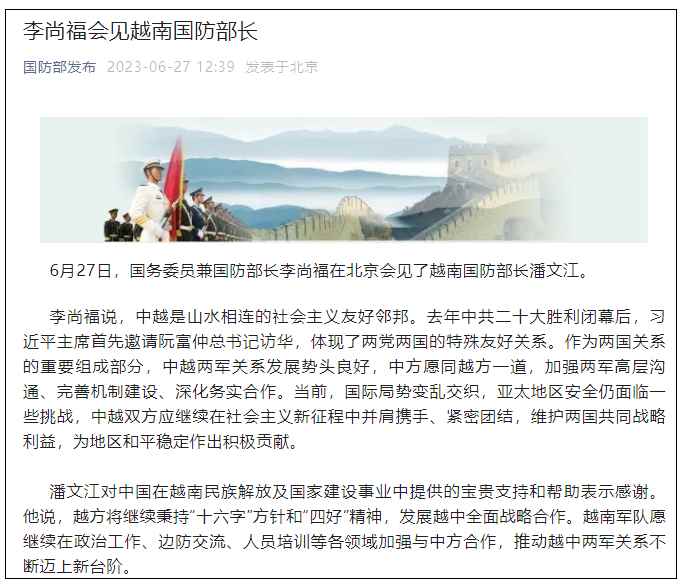 香港新聞網6月27日電 據微信公眾號“國防部發布”消息,6月27日,國務委員兼國防部長李尚福在北京會見了越南國防部長潘文江。