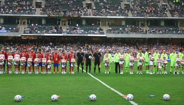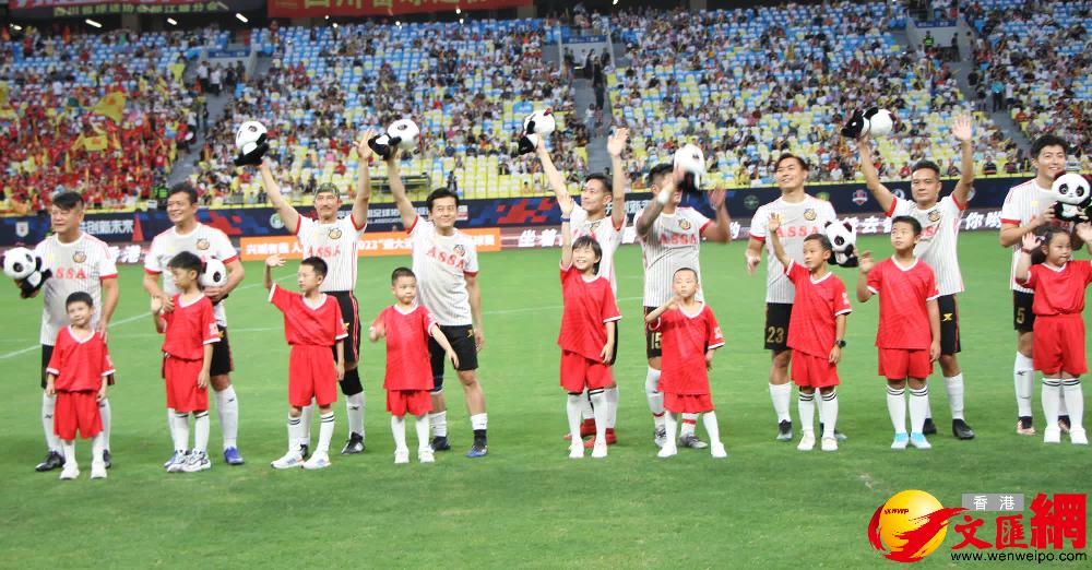 香港明星足球隊亮相。(香港文匯網記者 李兵 攝) 據香港文匯網報道,譚詠麟作為香港明星足球隊隊長率黃日華、陳百祥等隊員首發亮相,成都蓉耀足球隊隊長鄒侑根則帶領姚夏等隊員一起入場。18:55時,香港明星隊72歲老將譚詠麟主罰任意球完美助功,8號球員賴啟卓接球命中。全場球迷喝彩不斷,“雄起!”“雄起!”的加油聲此起彼伏。比賽進入第二節,成都蓉耀隊率先進一球,隨後香港明星隊再次進球,香港明星隊2:1領先。第三節比賽開始,成都蓉耀足球隊連進兩球,將比分改寫成3:2,實現反超。比賽最後時刻,香港明星隊71歲老將陳百祥打進最後一粒精彩進球,3:3戰平。全場球迷起身揮舞着手中的彩旗,喝彩聲一浪高過一浪。