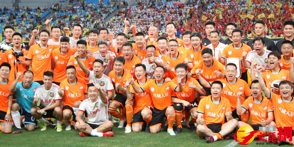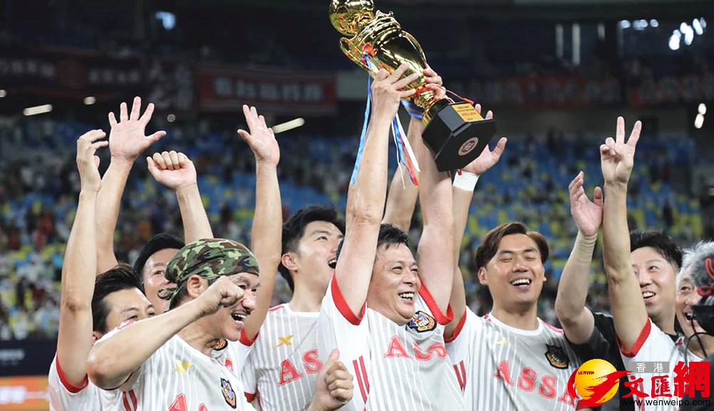 香港明星足球隊隊員舉起獎盃慶祝。(香港文匯網記者 李兵 攝) 3萬球迷綠茵場上卡拉ok 依稀往夢似曾見,心內波瀾現;拋開世事斷仇怨,相伴到天邊……第一節比賽結束後,兩位香港球員走進球迷中間唱起經典歌曲《鐵血丹心》,“靖哥哥”黃日華則在球場上比划起劇中的武術動作。接着,蓉方球員搶過話筒,深情獻唱《我的未來不是夢》,全場球迷熱血沸騰,歌聲響徹四方。港星一首《萬水千山總是情》,蓉方一首小虎隊的《愛》;李克勤的《紅日》、劉德華的《中國人》……一首首經典老歌在鳳凰山體育公園上空飄揚。
