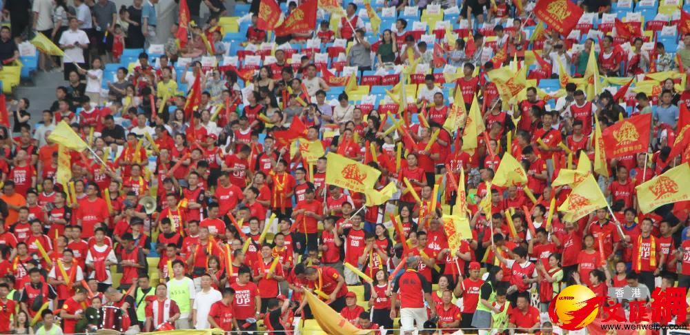 熱情似火的成都球迷。(香港文匯網記者 李兵 攝) 據悉,是次比賽打破了傳統足球賽制,分為三節進行,每節25分鐘。每節之間將穿插拉歌比賽,成都和香港兩地的著名主持人作為“啦啦隊長”,帶領全場觀眾激情參與。拉歌環節共兩輪,每輪10分鐘,以“致敬經典”和“潮流節拍”為主題,分別選擇耳熟能詳的港樂經典和流行熱歌。 在第二輪拉歌環節,黃日華、馮海倫共同演繹《瀟洒走一回》,頓時燃爆全場。最後,在譚詠麟的《講不出再見》以及《成都》優秀的樂曲聲中,現場拉歌落下帷幕。在拉歌環節中,“蓉寶”亮相盡情搖滾,吸引了不少香港明星隊球員與之互動。