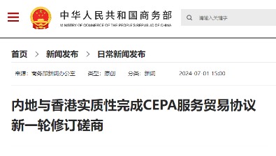 商務部台港澳司負責人談CEPA簽署20周年成果香港新聞網6月29日電 據商務部網站29日消息,商務部台港澳司負責人表示,今年是內地與香港、澳門特別行政區簽署《關於建立更緊密經貿關係的安排》(CEPA)20周年。CEPA是具有“一國兩制”特色、符合世貿組織規則的高水平自由貿易協議。CEPA實施20年來,內地與香港、澳門特別行政區在貨物貿易領域全面實現了自由化,在服務貿易領域基本實現了自由化,在投資領域建立了系統多元的保障制度,港澳地區走上了同祖國內地優勢互補、共同發展的寬廣道路。