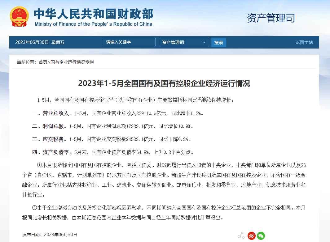香港新聞網6月30日電 中國財政部網站6月30日發佈2023年1-5月全國國有及國有控股企業經濟運行情況: 1-5月,全國國有及國有控股企業(以下稱國有企業)主要效益指標同比繼續保持增長。 一、營業總收入。1-5月,國有企業營業總收入329110.6億元,同比增長6.2%。 二、利潤總額。1-5月,國有企業利潤總額17838.1億元,同比增長10.9%。 三、應交稅費。1-5月,國有企業應交稅費24538.1億元,同比下降0.8%。 四、資產負債率。5月末,國有企業資產負債率64.8%,上升0.3個百分點。