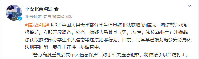 香港中通社7月3日電 據北京市公安局海澱分局3日通報,針對“中國人民大學部分學生信息被非法獲取”的情況,海澱警方接到報警後,立即開展調查。經查,嫌疑人馬某某(男,25歲,該校畢業生)涉嫌非法獲取該校部分學生個人信息等違法犯罪行為。目前,馬某某已被海澱公安分局依法刑事拘留,案件正在進一步調查中。