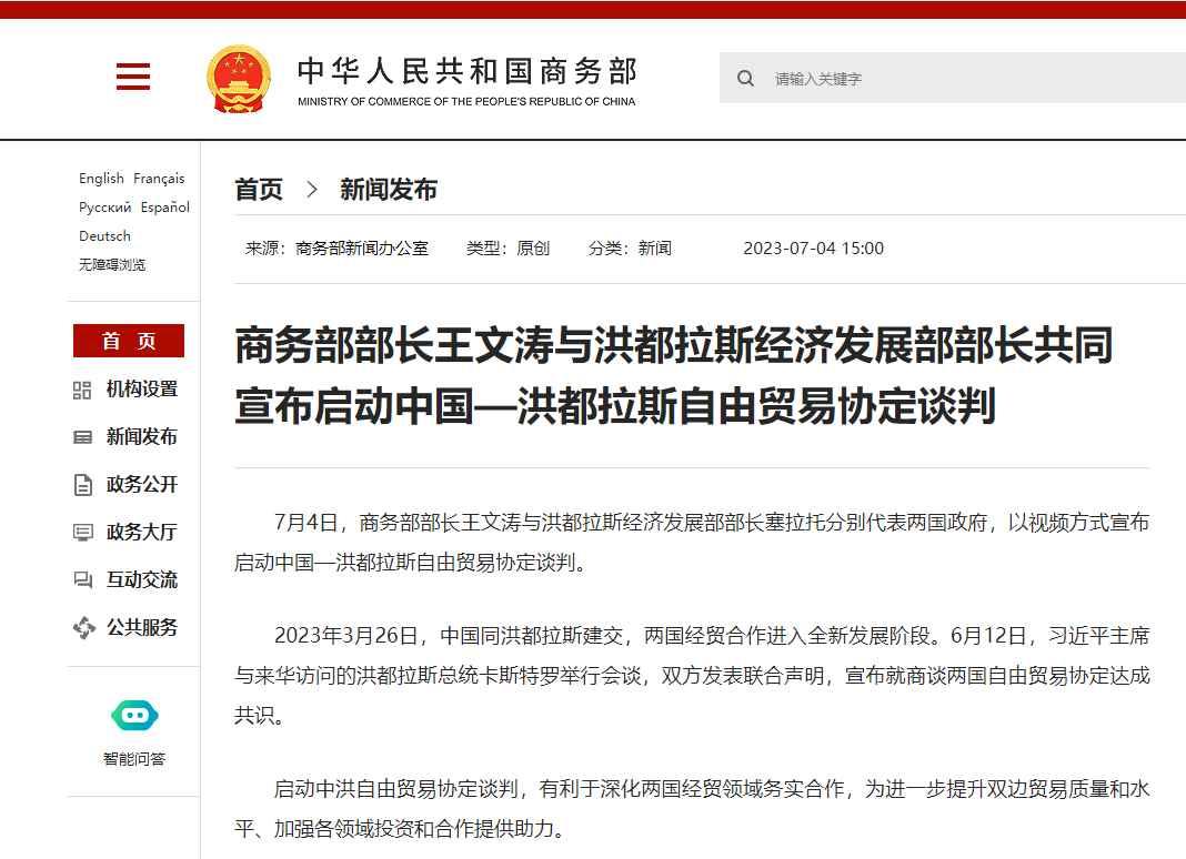 香港新聞網7月4日電 據中國商務部網站消息,7月4日,中國商務部部長王文濤與洪都拉斯經濟發展部部長塞拉托分別代表兩國政府,以視頻方式宣佈啟動中國—洪都拉斯自由貿易協定談判。