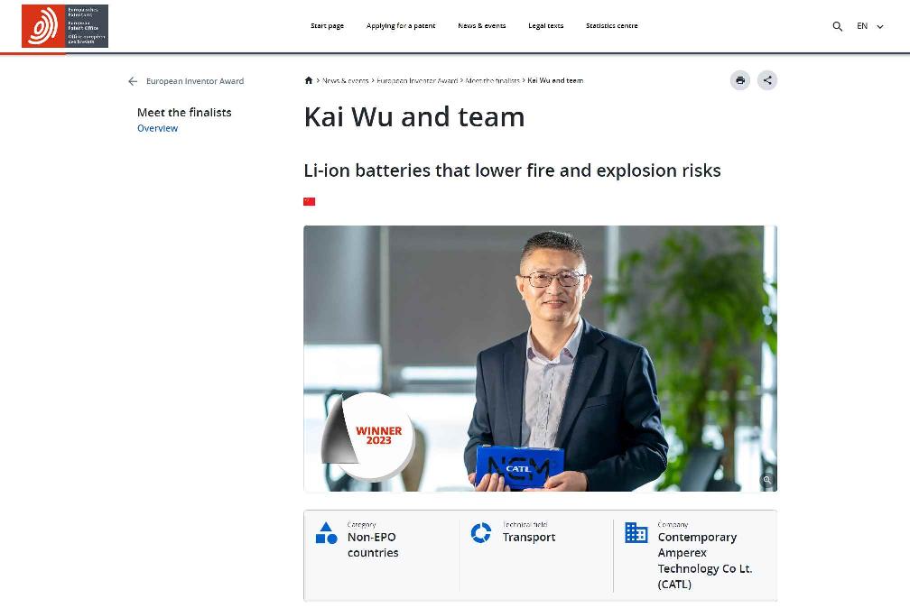 香港新聞網7月5日電 總部設在德國慕尼黑的歐洲專利局當地時間7月4日宣佈,中企寧德時代首席科學家吳凱及其團隊從600多名候選人中脫穎而出,榮獲2023年歐洲發明家獎(“非歐洲專利局成員國獎”類別)。