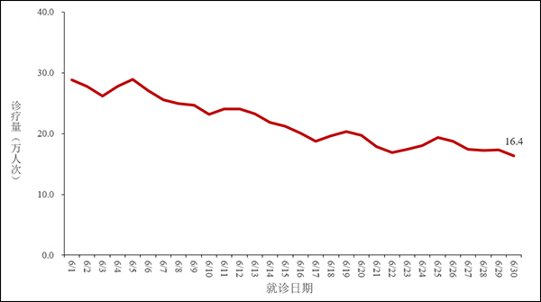 圖1 全國新冠病毒感染新增重癥和死亡病例報告情況 二、全國發熱門診(診室)診療情況 全國31個省(自治區、直轄市)及新疆生產建設兵團發熱門診(診室)診療量從2023年6月1日的28.8萬波動下降至6月30日的16.4萬。見圖2。