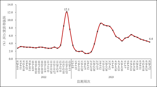 圖2 全國發熱門診(診室)診療人數變化趨勢 三、哨點醫院監測情況 全國哨點醫院流感樣病例佔門(急)診就診人數比例從2023年第22周(5月29日-6月4日)的5.5%持續下降至第26周(6月26日-7月2日)的4.4%。見圖3-1。