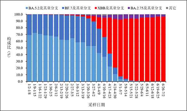 圖3-2 全國哨點醫院流感樣病例新冠和流感病毒陽性率變化趨勢 四、本土病例病毒變異監測情況 2023年6月1日-6月30日,全國31個省(自治區、直轄市)及新疆生產建設兵團共報送12431例本土病例新冠病毒基因組有效序列,均為奧密克戎變異株,涵蓋141個進化分支,主要流行株為XBB系列變異株,佔比前三位的分別為XBB.1.9及其亞分支、XBB.1.16及其亞分支、XBB.1.22及其亞分支。 根據采樣日期,XBB及其亞分支的佔比逐漸增加,從2023年第22周(5月29日-6月4日)的94.7%,增長到第26周(6月26日-7月2日)的96.2%。見圖4。