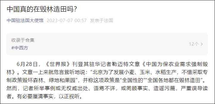 全文如下: 6月28日,《世界報》刊登其駐華記者勒邁特文章《中國為保農業需求強制毀林》。文章一上來就危言聳聽地說:“北京為了發展小麥、玉米、水稻生產,不惜採取專制政策毀壞森林、綠地和果園”,並稱這項政策是“全國性的”“全國各地都在毀林造田”。然而,記者所舉事例或無權威出處、語焉不詳,或罔顧事實、造謠污衊,嚴重誤導讀者。有必要厘清事實,以正視聽。 文章提及成都市民反映環城綠化帶被推平造田的事例,試圖給中國政府扣上毀林造田、政策前後矛盾、不顧當地群眾利益訴求暴力執法、破壞環境的帽子。但事實是什麽呢?成都環城生態區早期總體規劃中就存在10萬畝農田整治區。也就是說,文章談到的土地一開始即為耕地,並非由綠地改為耕地。有關改造旨在清除雜樹雜草,實施土地綜合整治,還耕地以本來面目,既可以解決過去多年形成的水系不暢、農田破碎、耕地質量不高等問題,又保留了生態空間總量,已經建成的自行車道、步行道和綠道等也不會被拆除,是一舉多得的好事。當地政府和負責綠道建設的集團負責人已經做出了解釋和說明。然而,該記者在進行報道時卻不做事實調查,妄做推斷,惡意歪曲事實,居心何在? 文章還提及上海一退休大爺因過度修剪樹木被罰款的案例。事實是他將自家院中的香樟樹冠全部砍掉,只保留了兩米左右的主幹,違反了《上海市居住區綠化調整技術規範》的有關規定。對其進行處罰是為了保護樹木和城市綠化環境、防止亂砍亂伐,卻被該記者抹黑為“中國政府禁止種樹”。如此有悖基本事實的報道令人咋舌,不禁讓人對這名記者的專業素養和職業道德產生懷疑。 眾所周知,中國作為人口大國,靠佔世界7%的耕地養活了佔世界20%的人口殊為不易,這本身就是對全球糧食安全的巨大貢獻。中國老話說,民以食為天。14億人的吃飯問題是天大的事,保障糧食安全是中國政府治國理政的頭等大事。習近平主席多次強調,耕地紅線一定要守住,農田就是農田,只能用來發展種植業特別是糧食生產,要落實最嚴格的耕地保護制度,像保護大熊貓一樣保護耕地;要堅決遏制“非農化”、有效防止“非糧化”;堅持良田糧用大原則,良田好土要優先保糧食,果樹苗木盡量上山上坡,蔬菜園藝更多靠設施農業和工廠化種植。 必須指出,在保護好生態環境前提下發展經濟已經成為中國政府和人民的共識和行動。幾十年來,中國政府和人民持之以恒地開展大規模植樹造林和國土綠化行動,2022年,中國森林面積2.31億公頃,森林覆蓋率達24.02%,40年增加了11個百分點。以毛烏素沙漠為例,在愛種樹的中國人幾十年不懈努力下,這個總面積4.22萬平方公里、比台灣島面積還大的中國四大沙漠之一,已經有80%被綠色覆蓋,即將成為全球第一個消失的沙漠。根據美國宇航局公佈的衛星數據,全球2000年到2017年新增的綠化面積中,25%以上來自中國,中國對全球綠化增量的貢獻率居世界首位。 中國政府一手抓糧食生產和安全,一手抓環境保護,取得的成績舉世矚目,卻被惡意扣上毀林造田的帽子。某些西方記者“逢中必反”的“心魔”可謂重矣。他們常年在中國生活,難道就不能睜開眼睛看看真實的中國,而非要憑著自己腦子裏的意識形態偏見去臆想中國,戴著有色眼鏡看待中國,罩著“陰間濾鏡”呈現中國?他們這樣做對增進西方民眾對中國的了解沒有好處,對西方國家決策者制定正確的對華政策沒有好處,對西方同中國開展競爭更沒好處。他們以為可以抹黑中國,結果卻是害了自己。 【編輯:丘志彬】