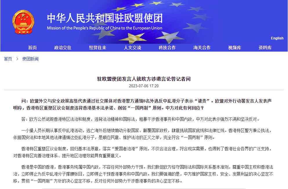 香港新聞網7月7日電 中國駐歐盟使團6日回應歐盟涉港言論,表示歐方公然詆毀香港特區法治和制度,違背法治精神和國際法,敦促歐方立即停止為反中亂港分子撐腰張目。