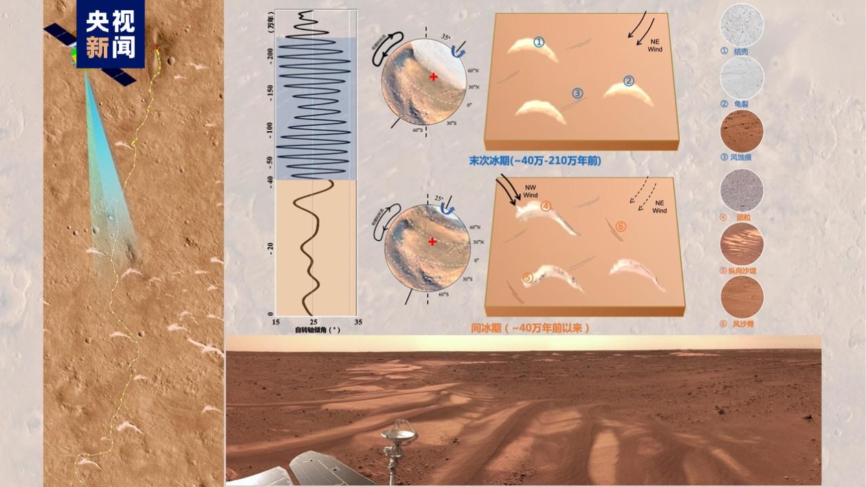祝融號著陸區沙丘探測和沙丘形成模式 在太陽系的行星中,火星與地球最為相似,火星的現狀和演化歷程,被認為可能代表著“地球的未來”,針對火星氣候演化的探測研究長期以來備受關註。風沙作用塑造了火星表面廣泛分布的風沙地貌、沉積,記錄了火星演化晚期和近代氣候環境特征和氣候變化過程。但由於缺乏就位、近距離詳細系統的科學觀測,我們對火星風沙活動過程和記錄的古氣候知之甚少。 針對這一科學問題,中國科學院國家天文台李春來團隊,聯合中國科學院地質與地球物理所郭正堂團隊、中國科學院青藏高原所、美國布朗大學和天問一號任務工程團隊,瞄準火星烏托邦平原南部豐富的風沙地貌,利用環繞器高分辨率相機、火星車導航地形相機、多光譜相機、表面成分分析儀、氣象測量儀等開展了高分辨率遙感和近距離就位的聯合探測,提取了沙丘形態、表面結構、物質成分等信息,分析了其指示風向和發育年齡,發現了著陸區風場發生顯著變化的層序證據,並與火星中高緯度分布的冰塵覆蓋層記錄有很好的一致性,揭示了祝融號著陸區可能經歷了以風向變化為標誌的兩個主要氣候階段,風向從東北到西北發生了近70度的變化,風沙堆積從新月形亮沙丘轉變為縱向暗沙壟。 這一氣候的轉變,發生在距今約40萬年前的火星末次冰期結束時,可能是由於自轉軸傾角的變化,火星從中低緯度到極地地區,發生了一次“冰期-間冰期”的全球性氣候轉變。該項研究有助於增進我們對火星古氣候歷史的理解,為火星古氣候研究提供了新的視角,也為地球未來的氣候演化方向提供了借鑒。 【編輯:丘志彬】