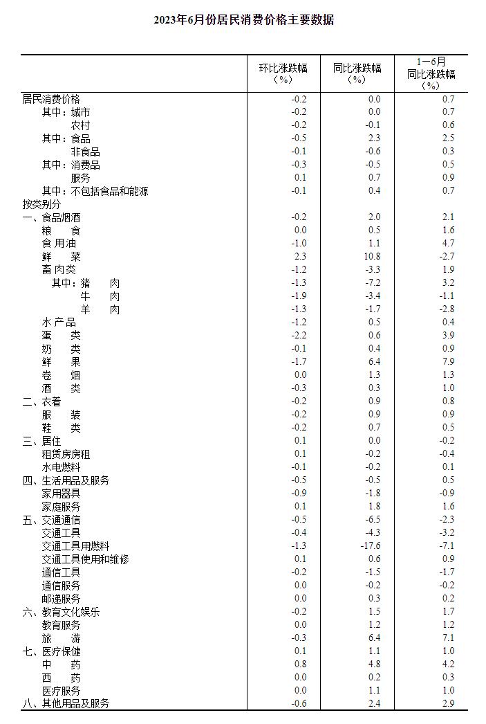 國家統計局:6月份居民消費價格同比持平,環比下降0.2%分享到:
