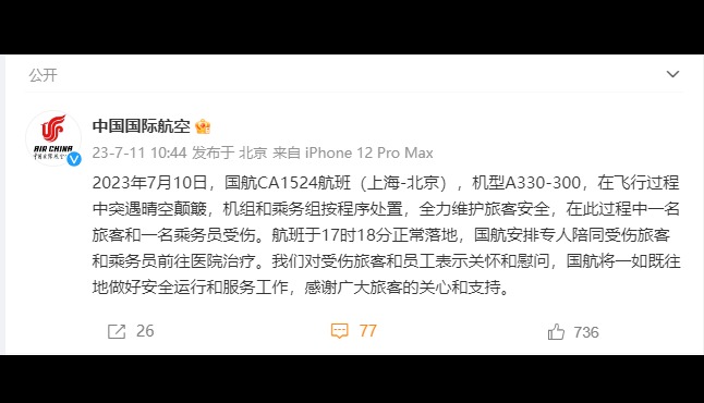 國航回應飛機嚴重顛簸:一名旅客和一名乘務員受傷分享到: