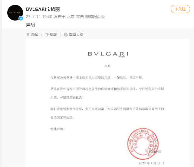 寶格麗致歉:海外官網店鋪地址和地圖標識誤註,已立即糾正分享到: