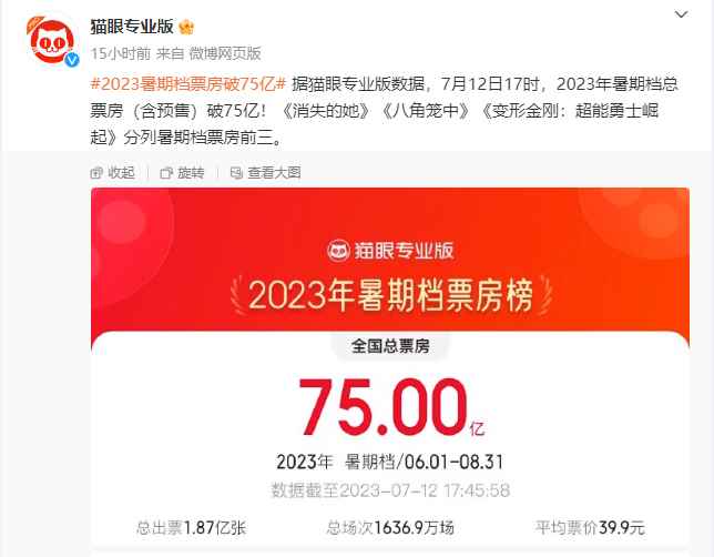 香港中通社7月12日電 據貓眼專業版數據,截至12日17時,2023年中國暑期檔電影總票房(含預售)突破75億元人民幣,國產電影《消失的她》《八角籠中》和美國電影《變形金剛:超能勇士崛起》分列暑期檔票房前三。