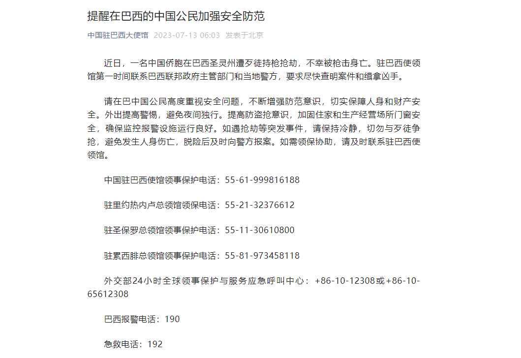 一中國僑胞在巴西遭搶劫槍殺,中使館發安全提醒分享到: