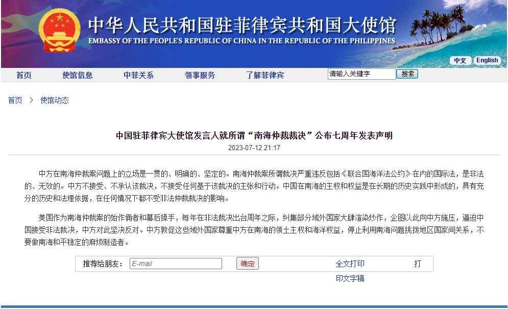 中國駐菲律賓大使館:中方不接受、不承認所謂“南海仲裁裁決”分享到: