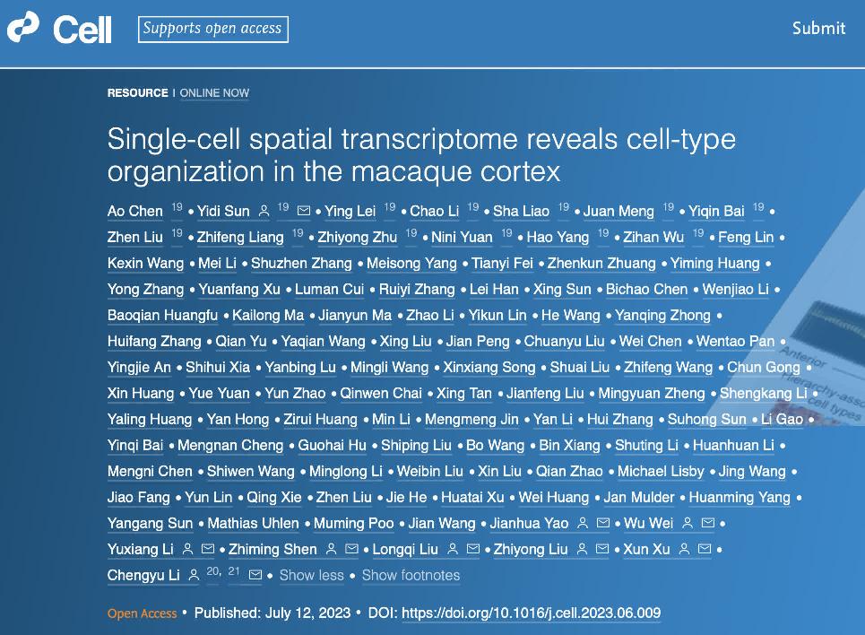 Cell期刊官網截圖 大腦由哪些細胞組成、這些細胞的空間分布有什麼規律是腦科學的基本問題,其重要性類似於人類基因組計劃完成的DNA鹼基序列。中國科學院腦科學與智能技術卓越創新中心(神經科學研究所)與華大生命科學研究院、臨港實驗室、上海腦科學與類腦研究中心、騰訊人工智能實驗室等單位組成的百餘人攻關團隊,成功繪製出獼猴大腦皮層的細胞類型分類樹,並揭示了細胞類型組成和靈長類腦區層級結構之間的關係,為進一步研究各類神經元之間的連接提供了分子細胞基礎。 獼猴是演化上最接近人類的模式動物,其大腦中包含超過60億個神經元。文章共同通訊作者、中國科學院腦科學與智能技術卓越創新中心研究員李澄宇(現臨港實驗室研究員)表示,大腦的細胞組成及其空間分布規律是腦科學的基本問題,而獼猴的大腦皮層組織在很多方面與人類相似。