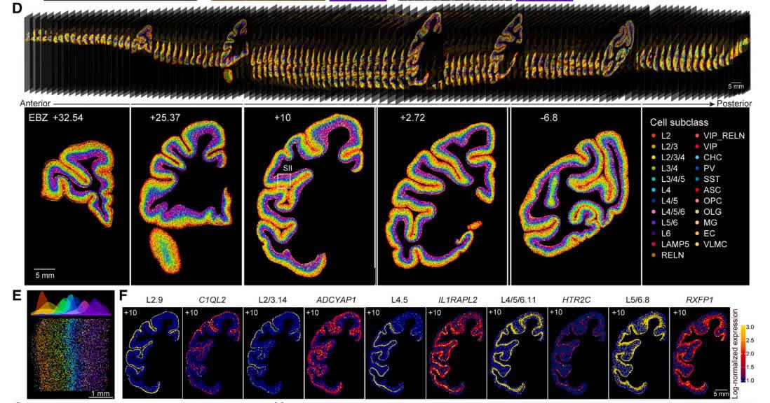 獼猴大腦皮層細胞類型空間分布圖譜 在研究中,研究人員通過華大時空組學技術Stereo-seq,採集了獼猴大腦161張厚度為10微米切片的空間轉錄組數據,並結合華大自主研發的另一項技術——高通量單細胞核轉錄組測序技術DNBelab C4 snRNA-seq,獲取了百萬級別的獼猴大腦皮層單細胞核轉錄組數據。同時,通過對獼猴大腦皮層的143個腦區中單個細胞的基因表達及狀態、空間信息進行聯合分析,研究團隊繪製了全球首個食蟹猴大腦全皮層的三維單細胞圖譜,並且繪製了細胞類型分類樹,揭示了不同類型細胞與腦區層級結構的關係。 研究團隊發現,獼猴大腦中大量興奮性神經元、抑制性神經元以及非神經元細胞在大腦皮層中的分布呈現明顯的各層面及各腦區的特異性。研究團隊又以視覺系統和軀體感覺系統為例,展開進一步研究,發現兩個系統的細胞類型組成與腦區層級組織之間存在顯著的相關性,處於相同層級的腦區往往具有類似的細胞類型組成,揭示了細胞組成和腦區結構之間的關係。 “獼猴腦細胞圖譜的繪製,將幫助我們更好地認識腦疾病,為未來設計疾病治療靶點提供基礎參考資源。”文章共同通訊作者、華大生命科學研究院院長徐訊認為,“它將有望推動腦科學領域的突破性進展,如在類腦智能和腦機接口中,通過更精確的腦電信號採集,實現更複雜的機體活動”。 中國科學院腦智卓越中心學術主任蒲慕明院士表示,未來,團隊將繼續在腦疾病機制與靶點研發、腦細胞與腦結構演化、腦功能的細胞分子機制等領域繼續攻關,推動中國在相關領域持續產生原創性、引領性成果。 本次研究由多家單位的100多位跨學科、跨領域的研究人員合作,依託我國自主研發的核心技術與大平台,以“大科學”科研攻關模式共同完成。研究產生了較為完整的全球首套獼猴全腦皮層的單細胞以及空間轉錄組數據,目前,數據資源庫現已實現公開共享。