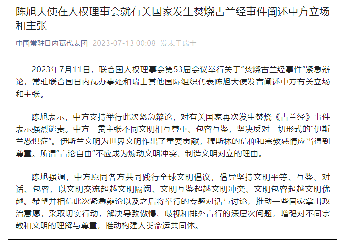 香港新聞網7月13日電 據微信公眾號“中國常駐日內瓦代表團”7月13日消息,7月11日,聯合國人權理事會第53屆會議舉行關於“焚燒古蘭經事件”緊急辯論,常駐聯合國日內瓦辦事處和瑞士其他國際組織代表陳旭大使發言闡述中方有關立場和主張。 陳旭表示,中方支持舉行此次緊急辯論,對有關國家再次發生焚燒《古蘭經》事件表示強烈譴責。中方一貫主張不同文明相互尊重、包容互鑒,堅決反對一切形式的“伊斯蘭恐懼癥”。伊斯蘭文明為世界文明作出了重要貢獻,穆斯林的信仰和宗教感情應當得到尊重。所謂“言論自由”不應成為煽動文明衝突、制造文明對立的理由。 陳旭強調,中方願同各方共同踐行全球文明倡議,倡導堅持文明平等、互鑒、對話、包容,以文明交流超越文明隔閡、文明互鑒超越文明衝突、文明包容超越文明優越。希望並相信此次緊急辯論以及之後將舉行的專題對話與討論,推動一些國家拿出政治意願,採取切實行動,解決導致傲慢、歧視和排外言行的深層次問題,增強對不同宗教和文明的理解與尊重,推動構建人類命運共同體。