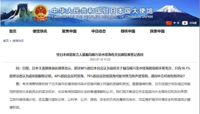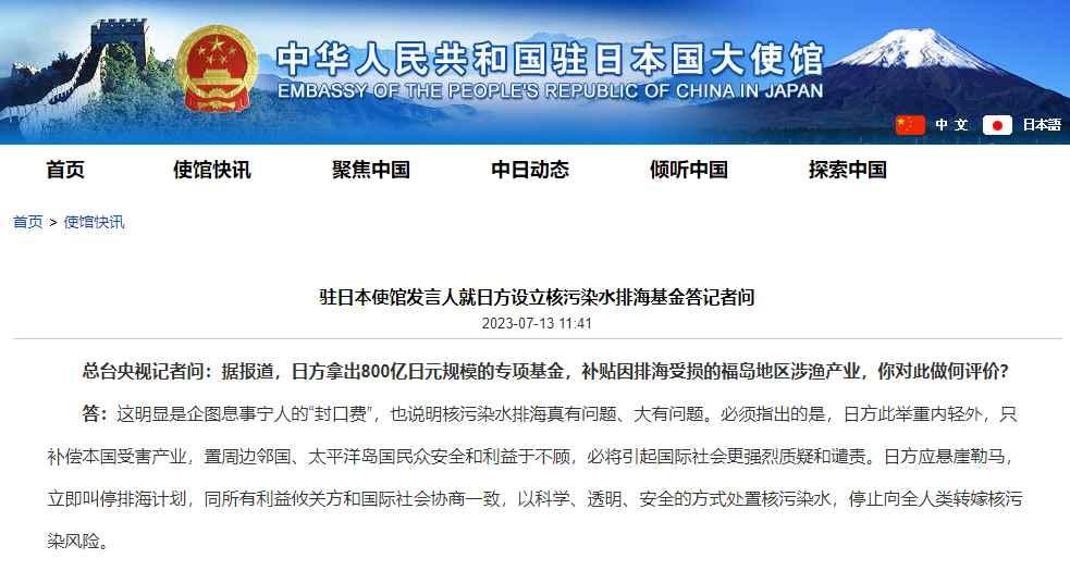 香港新聞網7月13日電 中國駐日本大使館網站7月13日消息,駐日本使館發言人就日方設立核污染水排海基金答記者問。