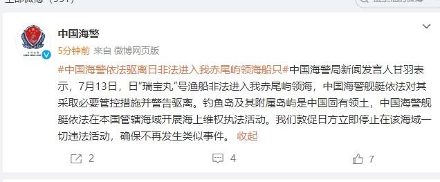 香港新聞網7月14日電 據@中國海警 7月13日消息,中國海警局新聞發言人甘羽表示,7月13日,日“瑞寶丸”號漁船非法進入我赤尾嶼領海,中國海警艦艇依法對其採取必要管控措施并警告驅離。釣魚島及其附屬島嶼是中國固有領土,中國海警艦艇依法在本國管轄海域開展海上維權執法活動。我們敦促日方立即停止在該海域一切違法活動,確保不再發生類似事件。