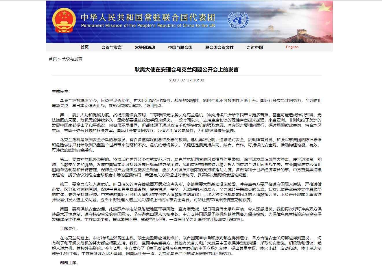 耿爽說,第一,要加大勸和促談力度。戰場形勢演變表明,軍事手段無法解決烏克蘭危機。衝突雙方要相向而行,探討照顧彼此關切、符合地區實際、有助於彌合分歧的解決方案。國際社會要共同努力,促進停火和談。烏克蘭危機是歐洲安全矛盾的總爆發,有許多值得深刻總結反思的教訓。危機的最終解決,關鍵還是要秉持共同、綜合、合作、可持續的安全觀,推動構建均衡、有效、可持續的歐洲安全架構。 第二,要管控危機外溢影響。新冠疫情後的世界經濟本就復蘇乏力,烏克蘭危機同其他因素相互作用叠加,給全球發展造成巨大衝擊。有關國家應立即停止濫施單邊制裁和長臂管轄,保障全球產業鏈供應鏈安全暢通,應加大對發展中國家的支持和援助力度,多做有利於世界經濟增長的事。黑海農產品外運協議對穩定全球糧食市場具有重要作用,中方希望有關方面通過對話協商,妥善解決黑海糧食外運問題。 第三,要全力應對人道危機。衝突當事方要嚴格遵守國際人道法,全力減輕平民遭受的苦難。中方鼓勵國際社會和人道機構在恪守人道救援原則基礎上加大對受危機影響民眾的人道救援力度。不負責任地轉讓集束炸彈極易引發人道主義問題,應平衡處理人道主義關切和正當的軍事安全需要,對轉讓集束炸彈持慎重克制態度。 第四,要確保核安全安保。中方再次呼籲衝突雙方保持最大理性克制,遵守《核安全公約》等國際法,堅決避免出現人為核事故。中方支持國際原子能機構繼續同各方保持接觸,為保障烏克蘭核設施安全安保發揮建設性作用。(完) 【編輯:丘志彬】