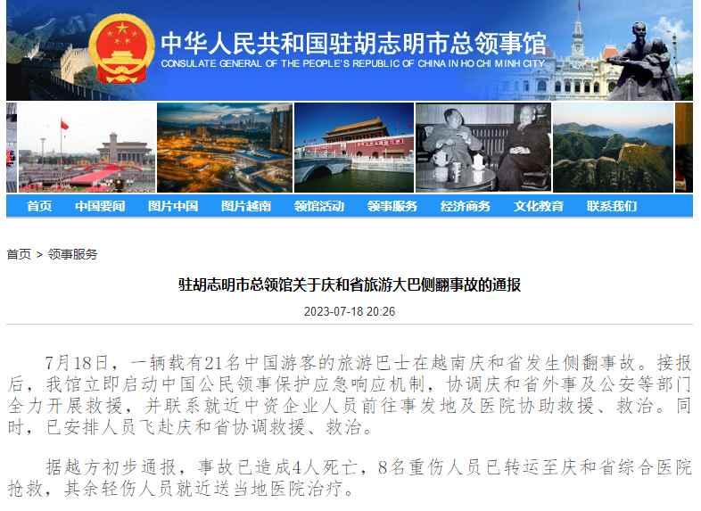 香港中通社7月18日電 7月18日,中國駐胡志明市總領事館發布通報稱,當天一輛載有21名中國遊客的旅遊巴士在越南慶和省發生側翻事故。