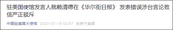 香港新聞網7月19日電 據中國駐美國使館微信公號消息,7月19日,中國駐美國使館發言人就賴清德在《華爾街日報》 發表錯誤涉台言論致信嚴正駁斥。