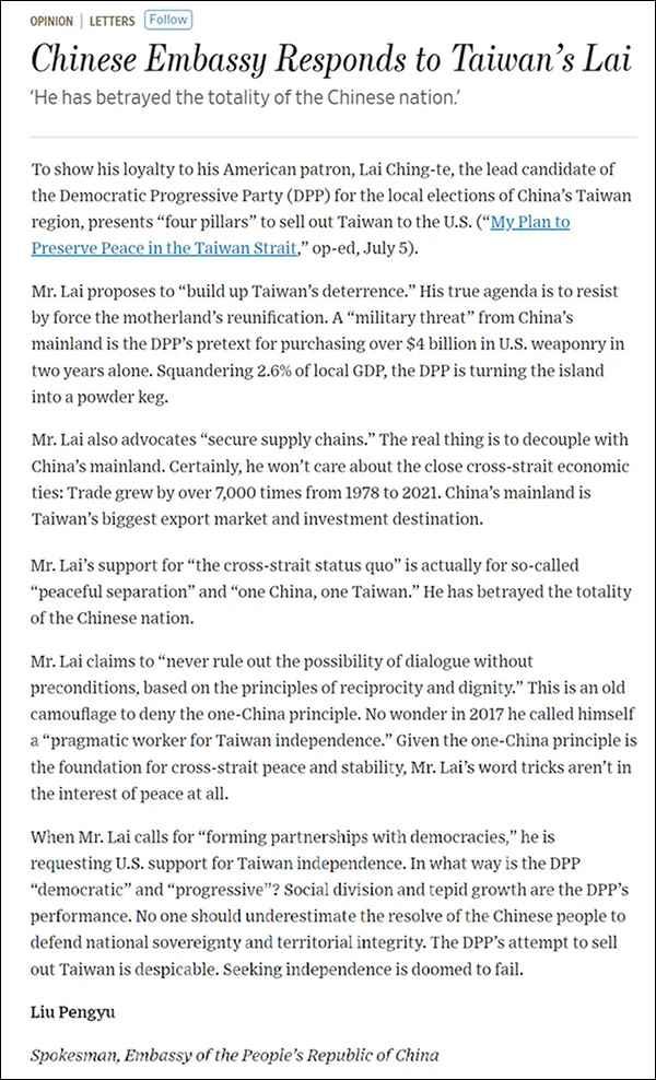 7月5日,《華爾街日報》刊登賴清德涉台署名文章。賴在文章中鼓吹所謂“四大支柱”歪論,粉飾民進黨當局到美賣台可恥行徑。中國駐美國使館發言人劉鵬宇就此致函該報編委會予以嚴正駁斥。信函主要內容已於7月18日在該報發表,全文如下: 近日,2024年台灣地區領導人選舉民進黨參選人賴清德在《華爾街日報》發文,鼓吹他所謂“四大支柱”歪論。賴清德選擇在美國媒體發文,再次向美遞出“投名狀”,抱美大腿。其“四大支柱”包藏的禍心用一個詞概括就是——賣台。 ——賴清德叫囂要提升台灣所謂“嚇阻力”,“以武拒統”陰謀昭然若揭。民進黨大肆渲染所謂大陸“軍事威脅”,目的就是騙取台灣老百姓支持其向美購買軍備。短短兩年時間,美對台軍售總值40億美元。台防務預算今年擴大至島內生產總值的2.6%。大量美軍備入台,使台灣島變成了危險的“火藥桶”。 ——賴清德大談所謂“強化台供應鏈安全”,暗含的是搞與大陸“脫鉤斷鏈”,全然不顧兩岸經貿密切聯結共生:1978年到2021年,兩岸貿易額增長了7000多倍;大陸連續21年成為台灣最大出口市場,也是台商島外投資的第一大目的地。 ——賴清德講“維持兩岸現狀”,實質是搞“和平分裂”、“一中一台”,出賣的是民族大義。賴宣稱“不排除在尊重,互利,沒有先決條件的基礎上,與大陸展開對話溝通”。這是民進黨當局拒絕承認“一個中國”原則的常用話術。賴早在2017年即自稱“務實的台獨工作者”,其“台獨”嘴臉暴露無遺。一個中國原則是兩岸和平的政治基礎,是台海穩定的定海神針。光靠玩弄文字遊戲,想給自己披上“和平”的外衣,只會欲蓋彌彰。 ——賴所謂強化“民主國家夥伴關係”,實質是攀附美國為其“謀獨”壯膽。民進黨執政這些年,島內社會撕裂,民生困頓,“民”在哪裏?“進”在何方? 任何人都不要低估中國人民捍衛國家主權和領土完整的堅強決心、堅定意志、強大能力!民進黨到美賣台為世人不齒,其謀“獨”挑釁必定失敗。 【編輯:丘志彬】