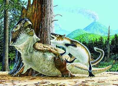 情景重現:1.25億年前,鸚鵡嘴龍(恐龍)遭到爬獸(哺乳動物)的攻擊。資料圖片(由合作研究者邁克爾·W.斯克雷普尼克提供) 據光明日報報道,該化石標本於2012年採自遼寧北票下白堊統義縣組陸家屯層,後由海南科技職業大學教授韓剛(合作研究者之一)捐贈給山東省威海紫光實驗學校博物館。其中的恐龍被確定為植食性鸚鵡嘴龍,大小與大型犬相當,生活在大約1.25億至1.05億年前的白堊紀早期。其中的哺乳動物為類似獾的爬獸,雖然與恐龍相比體型不算大,但也是白堊紀最大的哺乳動物之一。“爬獸和鸚鵡嘴龍被‘同框’發現並不新鮮,令人驚奇的是這塊化石所揭示的捕食行為。”加拿大自然博物館的古生物學家喬丹·馬隆博士表示。 據研究者描述,化石中,鸚鵡嘴龍呈俯臥姿態,後肢折疊在身體兩側;爬獸的身體向右盤繞,俯坐在鸚鵡嘴龍背側,抓扒著獵物的下巴並撕咬肋骨,其小腿則被鸚鵡嘴龍的後腿夾住。“這些現象表明,爬獸正在攻擊鸚鵡嘴龍,兩種動物被鎖定在殊死搏鬥中,並緊密交織在一起,成為首個顯示哺乳動物對恐龍捕食行為的實際證據。”喬丹·馬隆解釋。加拿大自然博物館的礦物學家亞倫·盧西耶博士分析了這塊標本的圍巖,結果證實圍巖基質中存在大量火山物質。 研究者相信,爬獸是在捕食鸚鵡嘴龍,而不是在啃食一具鸚鵡嘴龍的屍體,因為恐龍骨架上沒有留下任何被啃食的牙印。“如果鸚鵡嘴龍在遇到爬獸前就死了,那麽兩只動物就不太可能糾纏在一起。此外,爬獸位於鸚鵡嘴龍的背部方向,也表明它是攻擊者。”在喬丹·馬隆看來,爬獸實際上是想在鸚鵡嘴龍還活著時就吃掉它,只是它們同時葬身於即時的火山噴發以及隨後的泥石流中。 早在發現該標本前,古生物學家就知道爬獸會捕食包括鸚鵡嘴龍在內的恐龍,因為在一塊爬獸標本的胃中,他們發現了鸚鵡嘴龍幼年個體的骨骼殘留。研究者還推測,遼寧陸家屯源於火山噴發的沈積層將繼續產生物種間相互爭鬥的新標本和新證據。 【編輯:丘志彬】