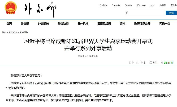 國家主席習近平將於7月27日至28日出席成都第31屆世界大學生夏季運動會開幕式,為來華出席開幕式並訪問的外國領導人舉行歡迎宴會和相關雙邊活動。