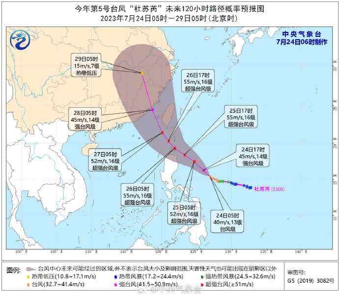 香港新聞網7月24日電 據中央氣象台網站消息,今年第5號颱風“杜蘇芮”24日上午8時位於距離台灣省鵝鑾鼻東南方向約940公里的菲律賓以東洋面上,中心附近最大風力14級(42米/秒,強颱風級)。預計“杜蘇芮”將以每小時10-15公里的速度向西北方向移動,強度繼續增強,最強可達超強颱風級(52-58米/秒,16-17級),並逐漸向台灣島南部沿海靠近,可能擦過或登陸台灣省西南部沿海,之後向福建沿海靠近,於28日早晨至上午登陸福建沿海(強颱風級,45-50米/秒,14-15級),登陸後向北偏西方向移動,強度迅速減弱。